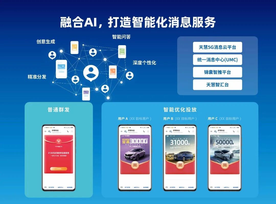 针对企业“内容创作难、用户匹配不准、客服响应慢”痛点,梦网科技打造AI+消息服务,其依托天慧5G消息云平台、统一消息中心(UMC)、锦囊智推平台三大技术底座,构建全流程智能化能力体系。内容生产端,可根据行业属性与场景需求自动生成定制化素材;用户匹配端,通过分析用户偏好、消费习惯等数据,实现“千人千面”精准分发;客服交互端,内置智能问答系统,企业可自主搭建知识库,为用户提供实时、精准的咨询服务,显著提升营销与客服效能。