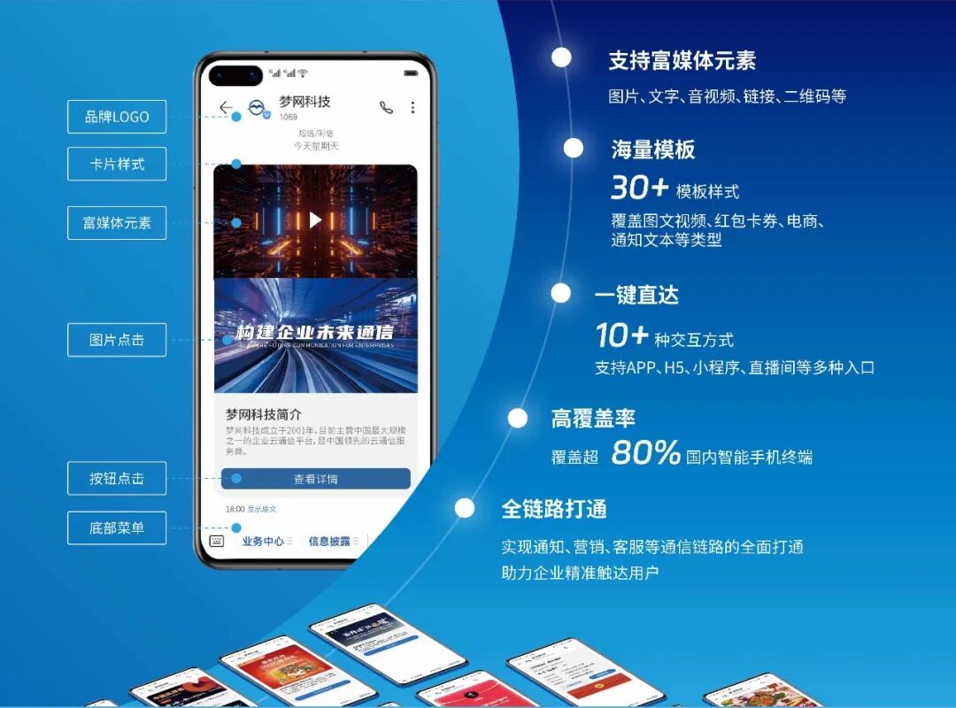 5G阅信服务凭借“富媒体+高覆盖+强触达”优势,打破传统文本通信局限。其支持图片、文字、长短视频、高清二维码等全形态富媒体元素混合编辑,以及30余套行业定制模板,实现“通知+营销+客服”全链路打通,用户点击消息可直接跳转至APP内页、H5活动页、小程序商城或直播专场,无需额外下载安装,有效缩短转化路径;目前已覆盖华为、小米、OPPO、vivo等主流品牌,适配超80%的国内智能手机终端,保障信息高效触达。